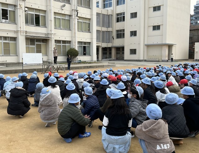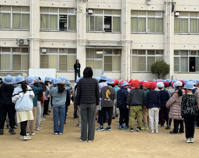 12月15日、児童朝会をしました。校長先生からは、「行ってきます」の言葉は、「行きます+帰ってきます」という意味です。今週は個人懇談会があります。下校の時間が早く、外で遊ぶ時間長いです。下校時もお家から出かけた時も、無事にお家へ帰りましょうとお話がありました。