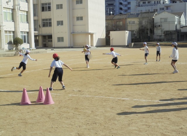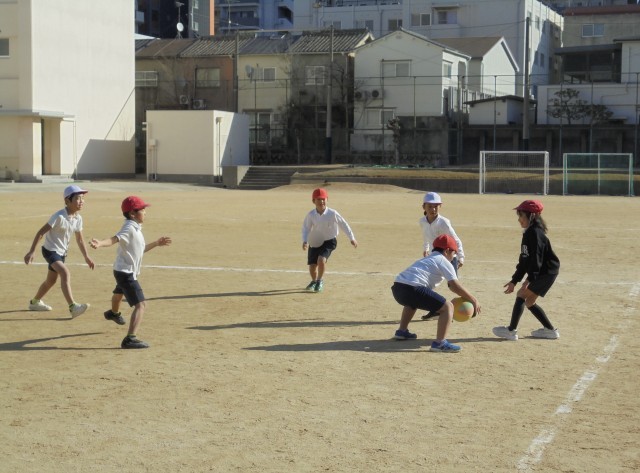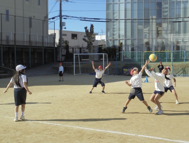 3年生が体育でボールゲームをしました。パスをつないで三角コーンにボールを当てると得点になるゲームです。高学年のバスケットボールのパスの出し方やパスをもらう動き方につながるゲームです。上手にパスをもらおうと瞬時に判断して動いていました。