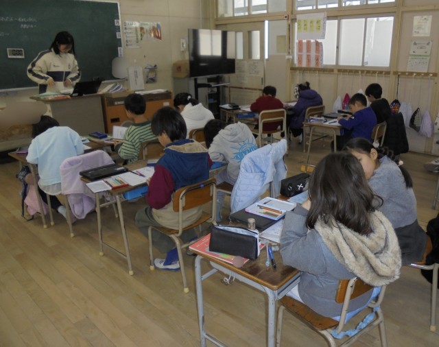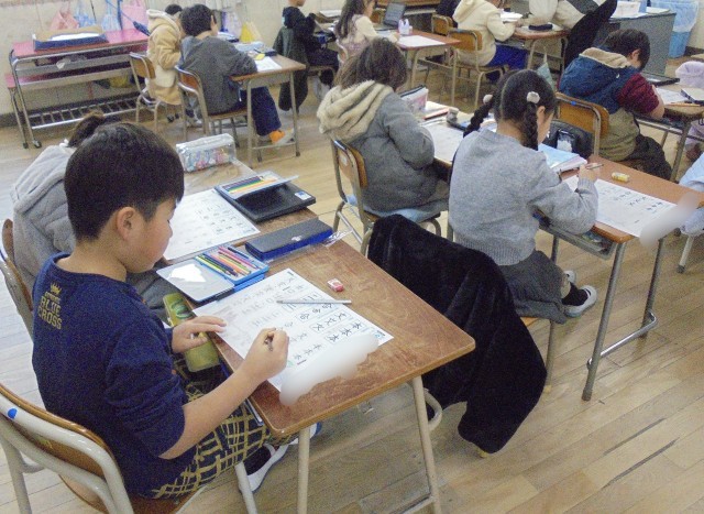 2年生が書写をしました。文字のどこに中心を合わせるか考え、一文字ずつ丁寧に書いていました。