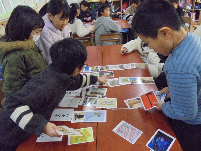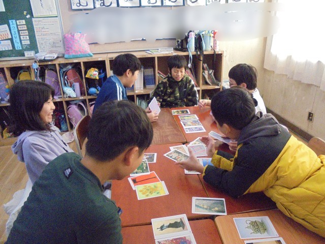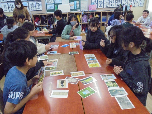 5年生が「アート・カードを楽しもう」をしました。ことばカードにあう絵カードを選んだり、4枚の絵カードを選び4コマ物語を作ったりしました。日本画、西洋画、抽象画などいろいろな絵画を楽しく鑑賞しました。