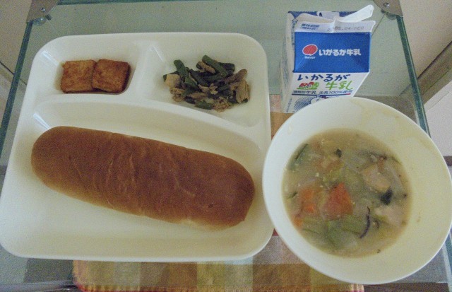 献立は、はくさいのとろみ煮、厚あげのピリからじょうゆかけ、豚肉とサンド豆のオイスターソース炒め、おさつパン、牛乳です。