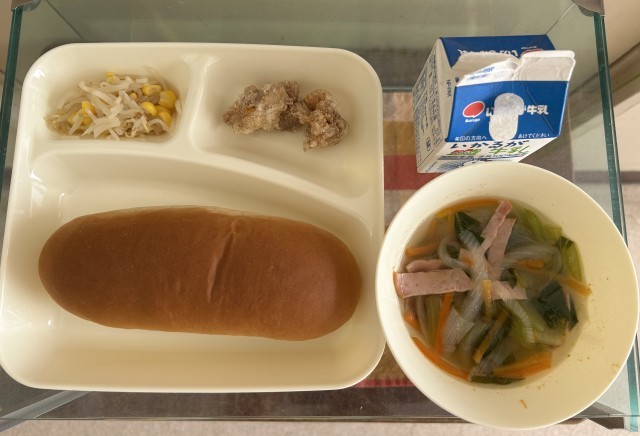 献立は、鶏肉のからあげ、ハムと野菜の中華スープ、もやしとコーンの中華あえ、黒糖パン、牛乳です。