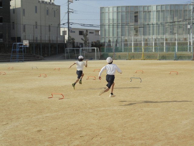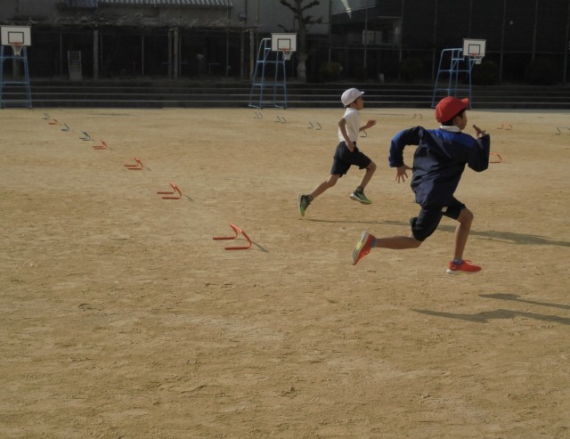 4年生が体育「小型ハードル走」をしました。35mの距離に4台の小型ハードルを並べ、一定のリズムで走り越えるタイムを計測しました。35mをフラット走する友だちと一緒に走りました。