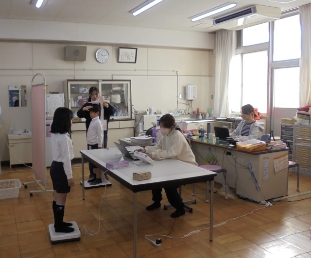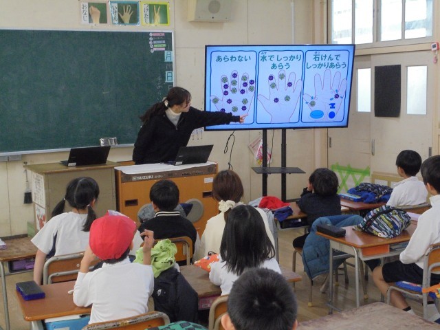 2年生が発育測定をしました。最初に、保健室の先生から教室で保健指導をしてもらいました。手洗いについて、どんなふうに手を洗えばいいかを学びました。
