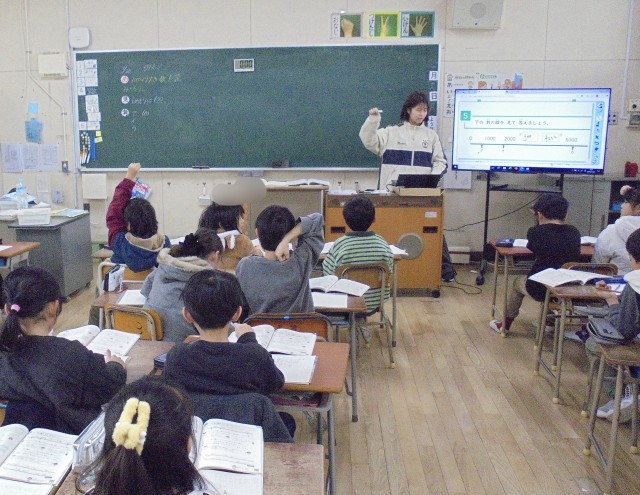 1組は、国語「正しい送りがなで書こう」を学習しました。みんなで正しい送りがなを黒板に書きました。2組は、算数「1000より大きい数を読もう」を学習しました。数直線のめもりを見て考えました。3組は、国語の単元テストをしました。