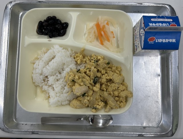 今日の給食におせち料理が登場しました。献立は、親子どんぶり、こう白なます、黒豆のにもの、牛乳です。