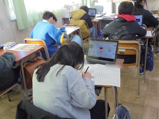 6年生が図画工作でタブレットラックを作ります。今日はタブレット端末を使いながら、デザインを描きました。
