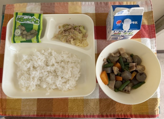献立は、筑前煮、ツナとキャベツのごま炒め、抹茶だいず、ご飯、牛乳です。