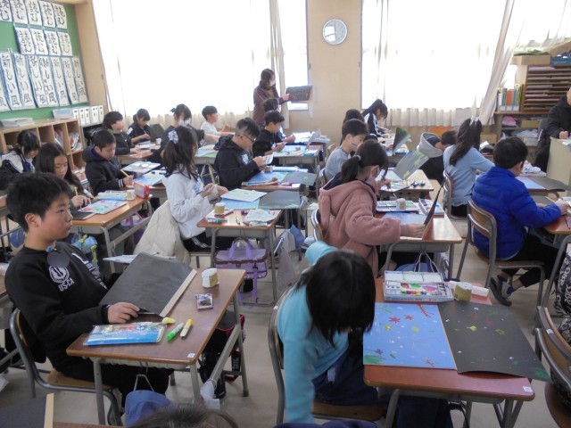 5年生が図画工作で一版多色版画をしています。版木に少しずつ色をつけて、すぐにこすります。こすった後は、黒い画用紙についた色を確認します。これを繰り返して多色版画を完成させます。