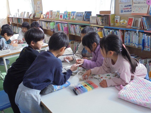 22日と23日は図書館祭りです。1年生から3年生は、図書館ボランティアさんによる本の読み聞かせとしおり作りをしてもらいます。牛乳パックにシールを貼ったり、絵を描いたりしてしおりを作ります。4年生から6年生は15分休みと昼休みに図書館館ボランティアさんからしおり作りを教えてもらいます。