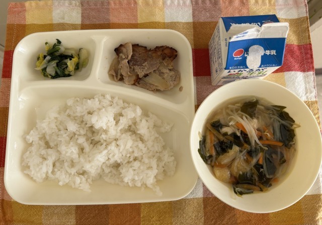 献立は、豚肉のスタミナ焼き、五目汁、きくなと白菜のおひたし、ご飯、牛乳です。
