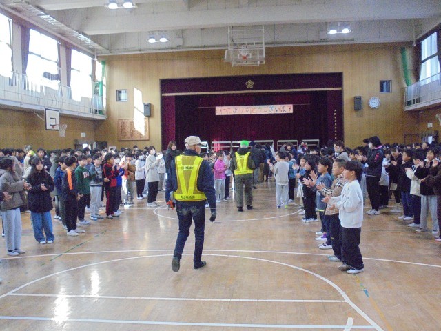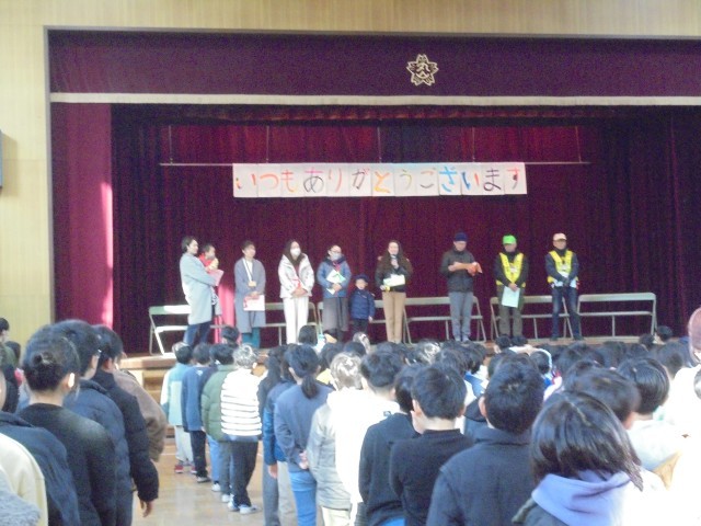 ボランティアの方からお話をしてもらいました。校長先生のお礼の言葉、代表委員の終わりの言葉で集会は終わりました。最後は感謝の拍手のなか、ボランティアの皆さんが退場されました。地域安全ボランティア、図書ボランティアの皆さん、子どもたちが安全に楽しく学校生活がおくれるようにと、ご協力いただきありがとうございました。