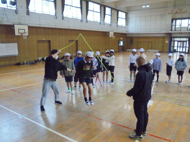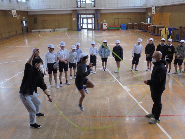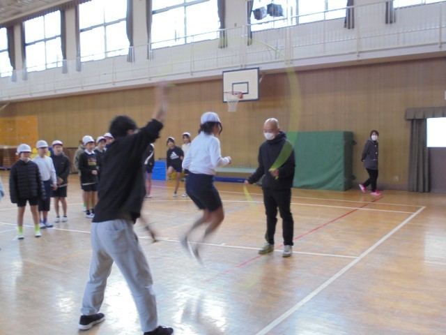5年生が体育館でダブルダッチをしました。ゲストティーチャーとして、ダブルダッチの世界選手権に出場した方をお迎えして、ダブルダッチを教えてもらいました。担任の先生と一緒に2本の縄を回しながら、入るタイミングの声かけをしてくれました。タイミングを合わせて縄に入り、ダブルダッチができました。