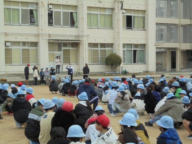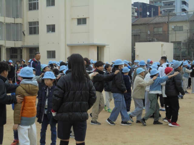 スマイル班で集合をして、児童集会をしました。集会委員会が考えたジャンケン列車をしました。1年と6年、2年と5年、3年と4年がジャンケンをしてスタートです。負けた人は、勝った人の列の後ろにつながります。長い長い列車ができている子がいました。