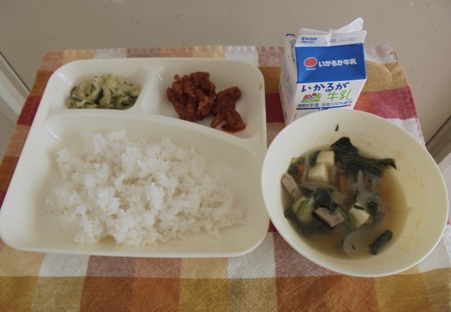 献立は、ヤンニョムチキン、とつふのスープ、切干だいこんのナムル、ご飯、牛乳です。