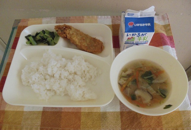 献立は、たらフライ、うすくず汁、こまつなのごまあえ、ご飯、牛乳です。