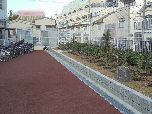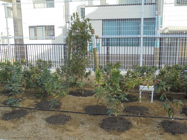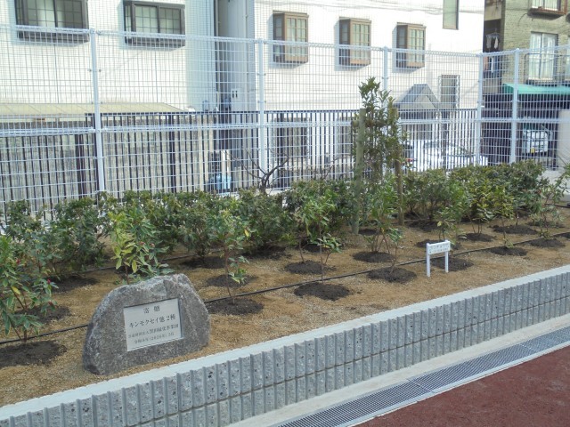 正門のあたりに新しく駐輪場ができ、その前の花壇に植樹をしました。緑化事業団の寄贈により、キンモクセイ、ジンチョウゲ、ヒラドツツジの3種類を植えました。寄贈ありがとうございました。