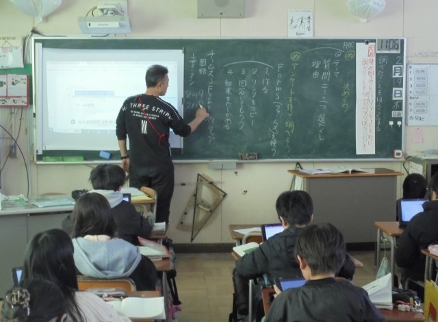 4年生が国語「身の回りのことについてアンケートを行い、調べたことをわかりやすく報告しよう」を学習しました。テーマを決め、2から3つ質問を考えました。その後、Fomsを使ってアンケートを作りました。