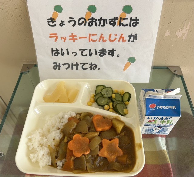 献立は、チキンレバーカレーライス、きゅうりとコーンのサラダ、洋なし(カット缶)、牛乳です。カレーライスの中に、星型、ハート型、桜の花びら型に切ったラッキーにんじんが入ってます。