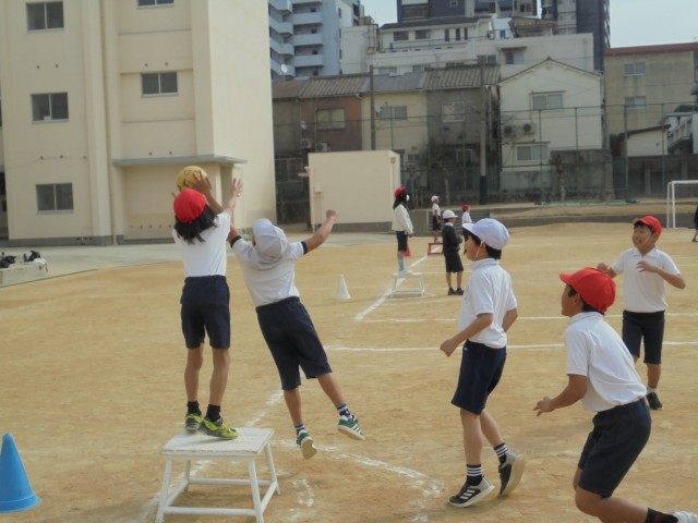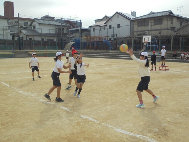 4年生がポートボールゲームをしました。パスを上手につなぐには、パスをもらう人の動きがポイントです。子どもたちはよく相談をしたり、声をかけ合ったりしてパスをもらいシュートをしていました。