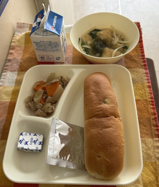 献立は、豚肉とごぼうの煮もの、なにわうどん、とろろこんぶ、固形チーズ、レーズンパン、牛乳です。