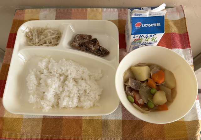 献立は、くじらのたつた揚げ、豚肉とじゃがいもの煮もの、もやしの甘酢あえ、ご飯、牛乳です。