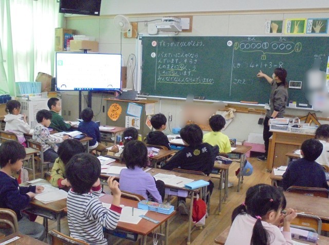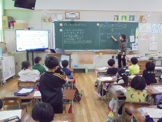 1年生が「バス停に人が並んでいます。そらさんの前に4人、後ろに3人います。みんなで何人並んでいますか」という問題を図を使って考えました。児童の中には、4+3にしてそらさんを並んでいる人数に入れることを忘れています。そんな時は図を使って考えるとわかります。