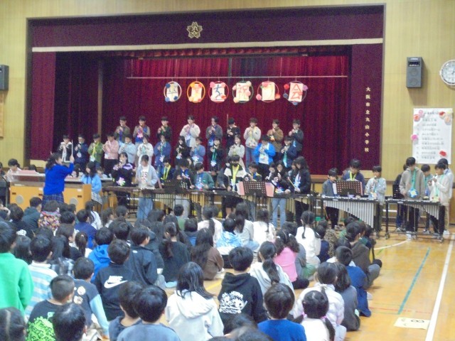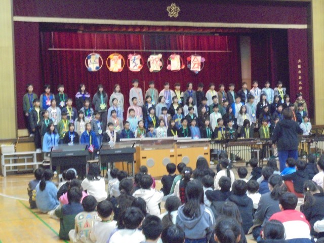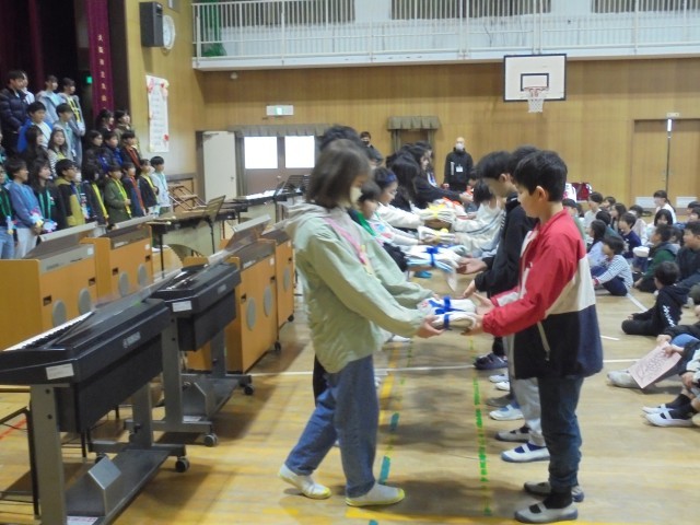 6年生からお礼として、合奏と合唱を披露してくれました。そして、6年生一人ひとりが作った雑巾を各学級にプレゼントしてくれました。6年生の皆さん、ありがとう。