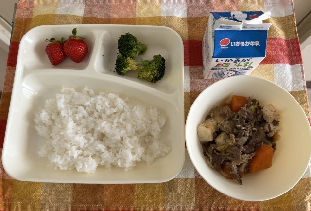 献立は、すき焼き煮、ブロッコリーのしょうがづけ、いちご、ご飯、牛乳です。