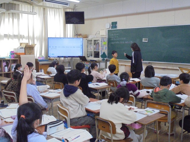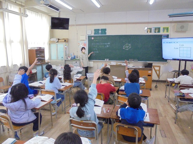 算数「面と面をつなぐ時は、どんなことに気をつければよいか」を学習しました。面と面が向かい合うとはどういうことかを、体を使って理解しました。また、別のクラスでは算数「はこの形のとくちょうをまとめよう」をしました。辺の長さ、辺の数、頂点の数ではこの形を考えました。