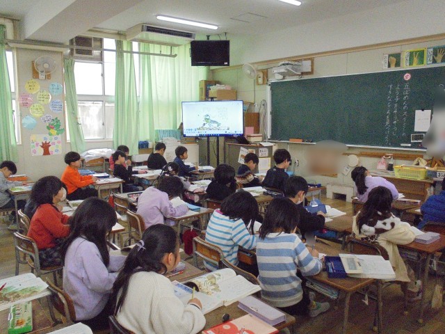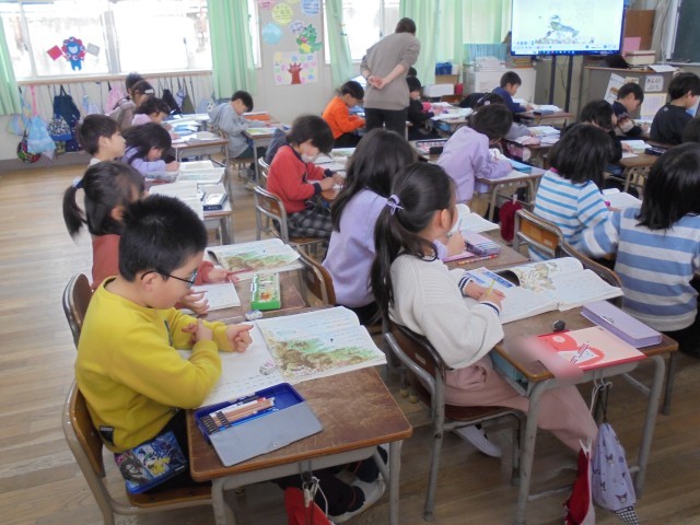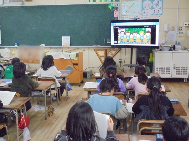 1組は国語「スイミー」を学習しています。今日は「5番目のスイミーの様子を想像し、好きなところを見つけよう」をしました。ノートに自分の好きなところを書きました。2組は音楽で「きみたちきょうからともだちだ」を歌いました。この歌は、新1年生の入学式で歌います。