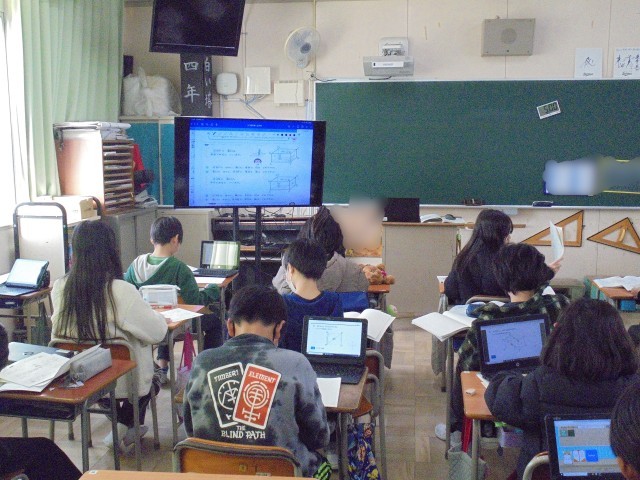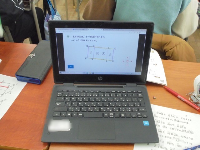 1組は国語「同じ読み方の漢字」を学習しました。漢字辞典を使って、同じ読み方をする漢字を調べノートに書きました。2組は算数「直方体と立方体」を学習しました。直方体には、並行な辺がそれぞれいくつずつ何組あるかを調べました。タブレット端末を使うと、3Dみたいに直方体が回ってよくわかりました。