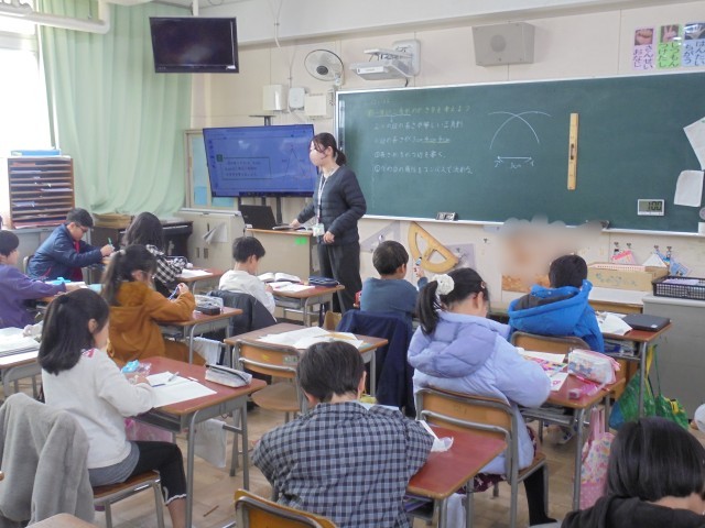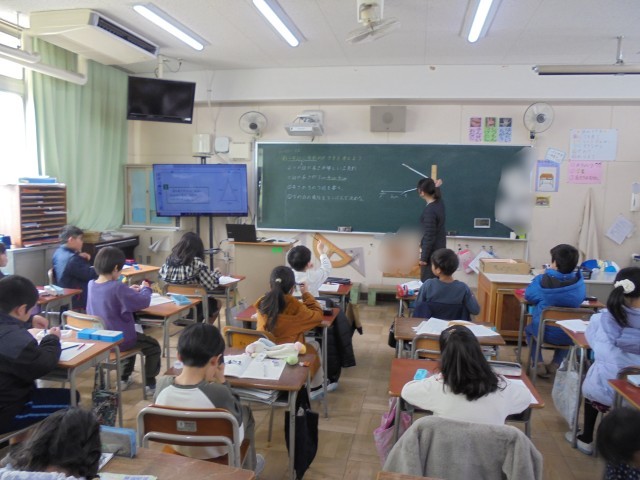 3年生が算数「三角形と角」の学習をしました。コンパスを使って二等辺三角形の書き方を学びました。コンパスの使い方を復習しながら、二等辺三角形を書きました。
