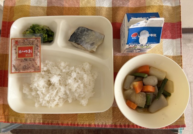 献立は、さごしの塩こうじだれかけ、さといもと野菜の含め煮、なのはなのおひたし、かつおぶし、ご飯、牛乳です。