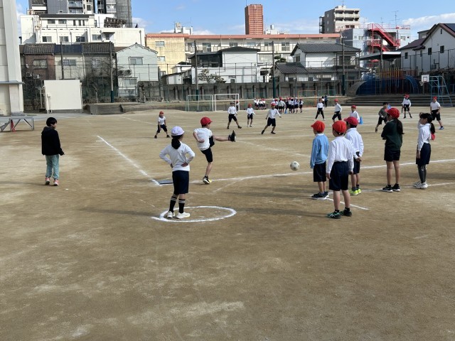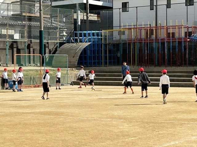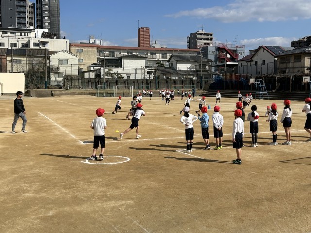3年生の2クラスで合同体育で、キックベースボールをしました。ボールを蹴った後は、1塁、2塁、3塁と回ります。守っているチームはボールを取って、全員が円の中へ行きます。円の中に入ったらアウトになります。みんなが楽しめるルールです。