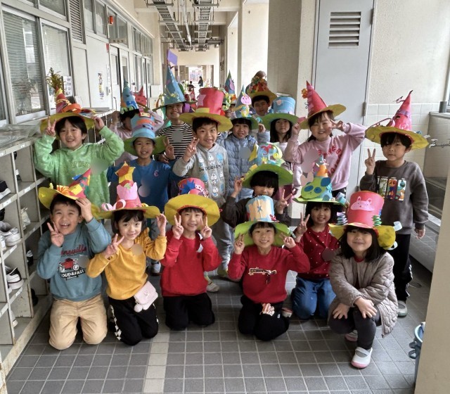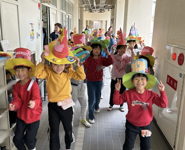 突然1年生が職員室へ来ました。図画工作で作成した帽子をかぶって、見せに来てくれました。とてもすてきな帽子ができ、みんなお似合いです。職員室前の廊下で記念撮影をしました。