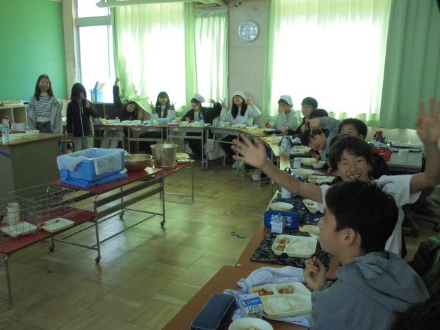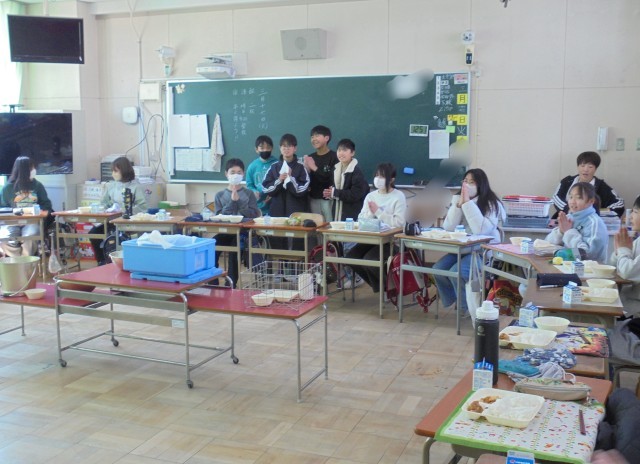 今日は、6年生にとって小学校生活最後の給食です。各クラスをのぞきに行くと、どのクラスも机をまるくして食べていました。楽しく美味しく給食をいただきました。給食調理員さん、6年間毎日おいしい給食を作ってくださり、ありがとうございました。