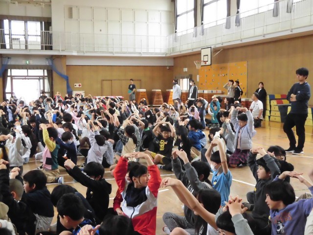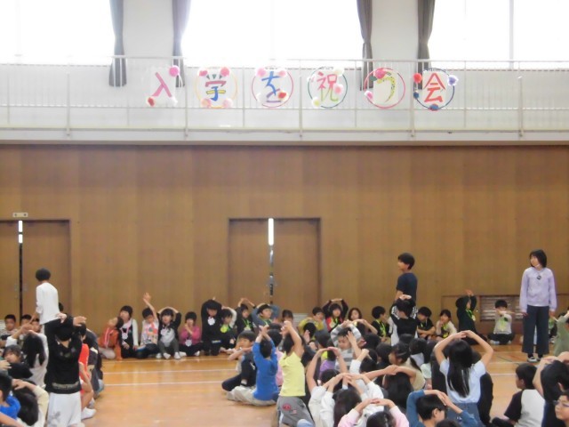 お兄さん、お姉さんたちからの歓迎のことばや丸山小学校〇✕クイズ、1年生からのことばなどがありました。