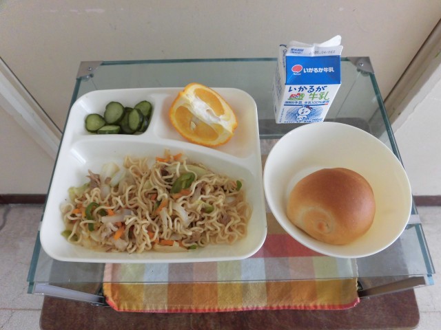 今日の給食は「やきそば、きゅうりのしょうがづけ、ミニコッペパン、あまなつかん、牛乳」でした。