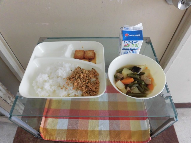 本日の給食は、「鶏肉とじゃがいもの煮物、厚揚げの醤油だれかけ、紅鮭そぼろ、ごはん、牛乳」でした。