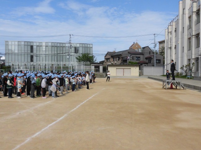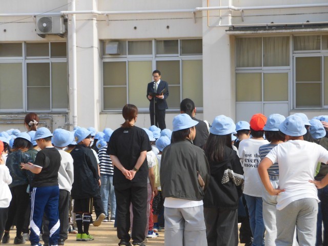 今年度、初めての朝会を運動場で行いました。