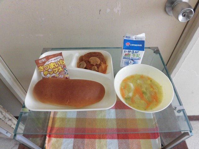 本日の給食は、「煮込みハンバーグ、コーンスープ、おさつチップス、黒糖パン、牛乳」でした。