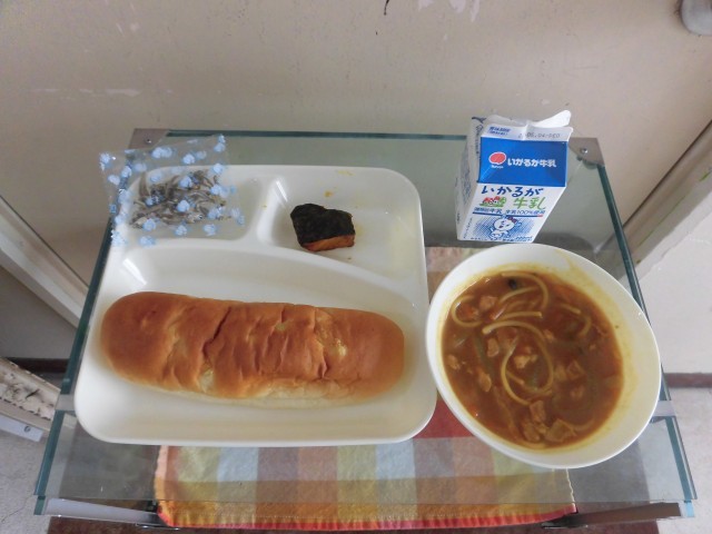 本日の給食は、「カレースープスパゲッティ、かぼちゃのマリネやき、ミニフィッシュ、おさつパン、牛乳」でした。