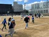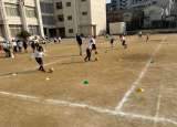 1組と2組が合同体育をしました。運動場でジグザグドリブルをしました。足の内側で...