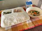 献立は、豚肉のごまだれ焼き、みそ汁、きくなとはくさいのおひたし、ご飯、牛乳です。
