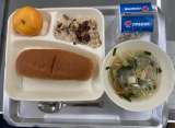 献立は、金時豆の中華おこあ、中華スープ、みかん、黒糖パン、牛乳です。