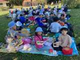 お楽しみのお弁当タイムです。広々とした公園で友だちと仲よくお弁当を食べました。