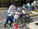 体育館では車いすに乗って操作する体験をしました。次は、花の広場や廊下を使って、...