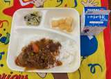 献立は、ハヤシライス、キャベツのひじきドレッシング、白桃の缶詰、牛乳です。ハヤシ...