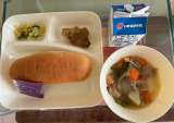献立は、鶏肉のカレー風味焼き、スープ煮、野菜のソテー、コッペパン、ブルーベリー...